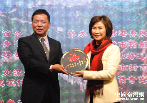 北京市臺聯副會長潘新洋與高雄河邊餐飲集團董事長張素鑾互贈禮品。(北京通訊員 郭寧 攝)