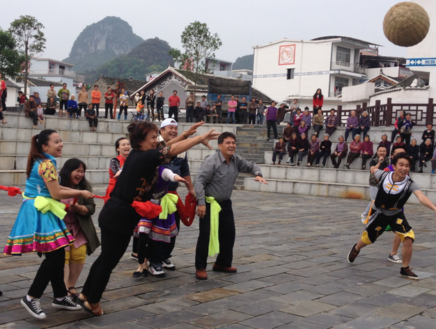 花蓮縣萬榮鄉(xiāng)參訪團成員在河池市羅城仫佬族自治縣東門鎮(zhèn)石圍古村體驗具有廣西民族特色的“竹球”