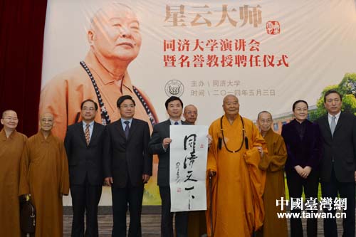 中國臺灣網(wǎng)5月4日上海消息 5月3日上午,臺灣佛光山開山宗長、國際佛光會世界總會會長、禪門臨濟宗第48代傳人星云大師訪問同濟大學(xué),并受聘為該校名譽教授。上海同濟大學(xué)黨委書記周祖翼會見了星云大師一行。校長裴鋼向星云大師頒發(fā)名譽教授聘書并其佩戴了校徽。