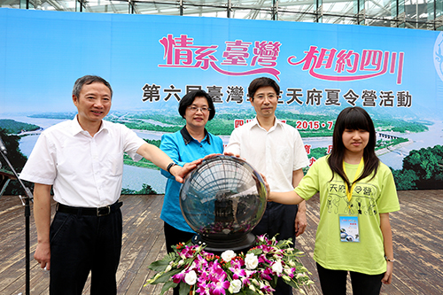 四川省臺辦主任周敏謙(左一)、省教育廳廳長朱世宏(右二)、臺灣民意代表王惠美(左二)及臺灣學生代表(右一)共同按動夏令營啟動球。(圖片來源:四川省臺辦)