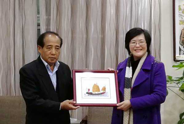 汕頭市委常委、統戰部部長陳麗文(右)向簡東明(左)贈送紀念品