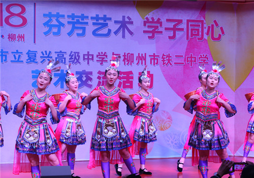 復興高中師生們在柳鐵二中老師同學們陪伴下,參觀該校書畫工作室、古箏工作室、書畫館,并到學校藝術中心參觀器樂、聲樂、播音、戲劇、舞蹈專業功能室展示和運動區體育專業訓練。柳鐵二中校長覃桂寧介紹了柳鐵二中校園文化營造、課程設置、校舍建設、辦學特色等情況。兩校同學們用不同樂器演奏出動聽的旋律,用優美的舞姿展現藝術的魅力,還交換紀念禮物,互加微信,共敘友誼。