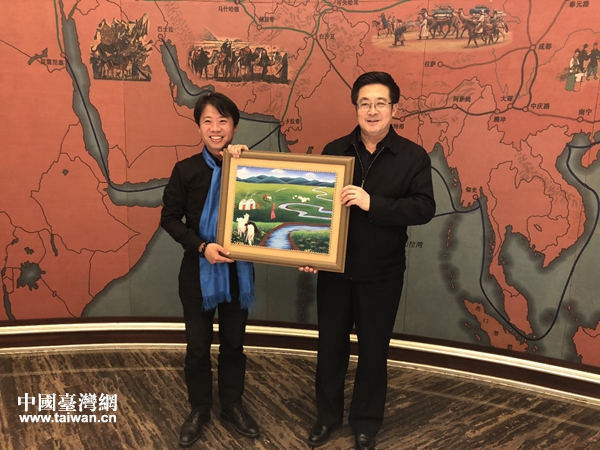 自治區臺辦主任楊利民(右)向何溢誠先生(左)贈送宣傳品。(圖片來源:內蒙古臺辦)
