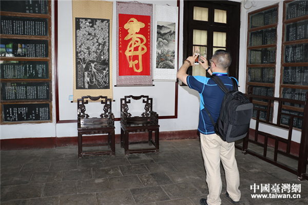 臺灣《聯(lián)合報》總經(jīng)理楊大德拍攝清代清代書法家葉志詵臨摹蘇東坡書法,所寫的一筆“壽”字。(中國臺灣網(wǎng) 郜利敏 攝)