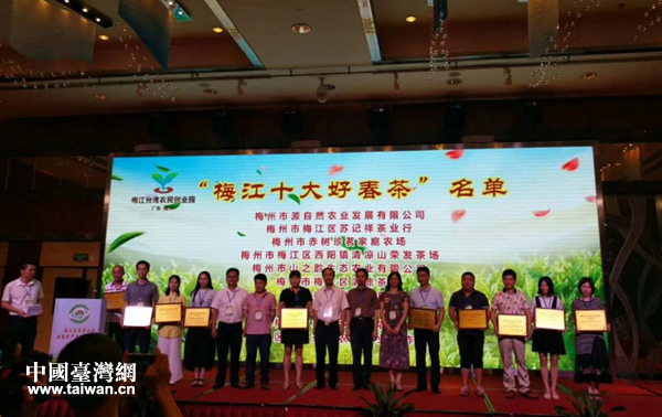 海峽兩岸專家為榮獲”梅江區十大好春茶“的茶企業頒獎。(圖片來源:梅州臺創園)