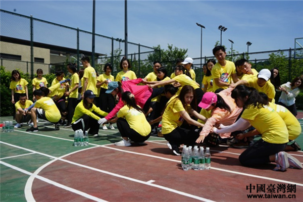 在群龍取水項目中,大家用身體支撐隊員依次取水,合力完成挑戰。(圖片來源;湖南省臺辦 汪夢媛 攝)