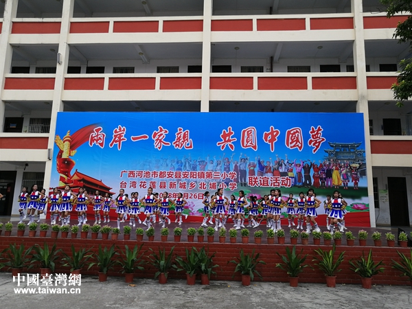 中國臺灣網7月2日河池訊 6月26日,激昂的鼓點、優雅的歌聲、臺灣少數民族韻味的音樂、氣勢如虹的武術表演叱喝聲、歡快的笑聲和掌聲,在廣西河池市都安縣安陽鎮第三小學校園內蕩漾,這是臺灣花蓮縣新城鄉北埔小學師生一行30人到該校開展聯誼交流活動的歡樂場景。