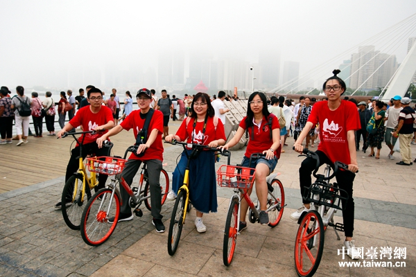 臺灣學生在大陸學生的幫助下,打開手機APP,搜索定位附近共享單車,掃碼騎行。“隨掃隨騎,鎖車走結束消費,真是超級方便。”嘉南藥理大學許郡庭對共享單車點贊。