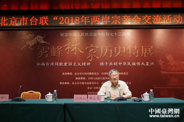 中國臺灣網(wǎng)8月14日北京訊 8月13日,北京市臺聯(lián)組織的“2018年兩岸宗親會交流活動”在京開啟。以臺灣抗日志士親屬協(xié)進(jìn)會理事長林銘鐔為團(tuán)長的臺灣霧峰林家參訪團(tuán)一行14人等應(yīng)邀參加活動。活動期間,將舉辦專題報告會和“霧峰林家”歷史特展、拜會全國臺聯(lián)、參觀中國人民抗日戰(zhàn)爭紀(jì)念館和山西平型關(guān)戰(zhàn)役遺址。
