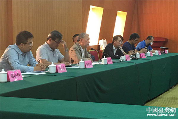 新竹邱鏡淳(左三)在座談會講話。(圖片來源:河北省臺辦、石家莊市臺辦)
