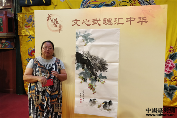 與高風(fēng)相鄰是來自高雄的水墨畫家蔡梅芳,她同樣以芭蕉葉入畫,畫作中綴滿半紅蓮霧的果樹枝穿葉而出,葉下兩只小鴨圍著掉落的蓮霧果嘻戲謙讓,她說,畫作寓意大陸和臺(tái)灣都是一家人,希望大陸和臺(tái)灣今后能夠繼續(xù)和諧相處,更希望祖國早日統(tǒng)一。