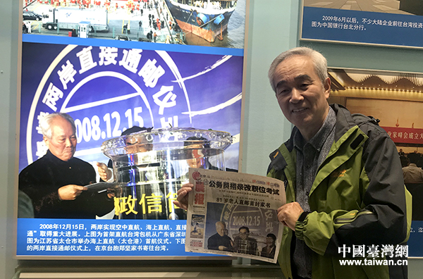 站在注釋為“北京市舉辦兩岸直接通郵儀式”的照片前,在京臺胞徐波的心情格外激動。圖片記錄了2008年12月15日兩岸實現空中直航、海上直航、直接通郵后,徐波的父親、在京臺胞鄭堅將寄往臺灣的家書投入郵筒的珍貴歷史瞬間。這也是兩岸隔絕三十多年后,鄭堅第一次不用再通過美國、香港等第三地輾轉,直接給臺灣的親人寄信。
