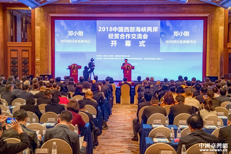 “中國西部海峽兩岸經(jīng)貿(mào)合作交流會”始于1998年,從2013年開始每年連續(xù)舉辦,已成為兩岸經(jīng)貿(mào)交流合作的知名品牌。圖為2018年10月17日舉行的“2018中國西部海峽兩岸經(jīng)貿(mào)合作交流會”開幕式現(xiàn)場。(圖片來源:四川省臺辦)