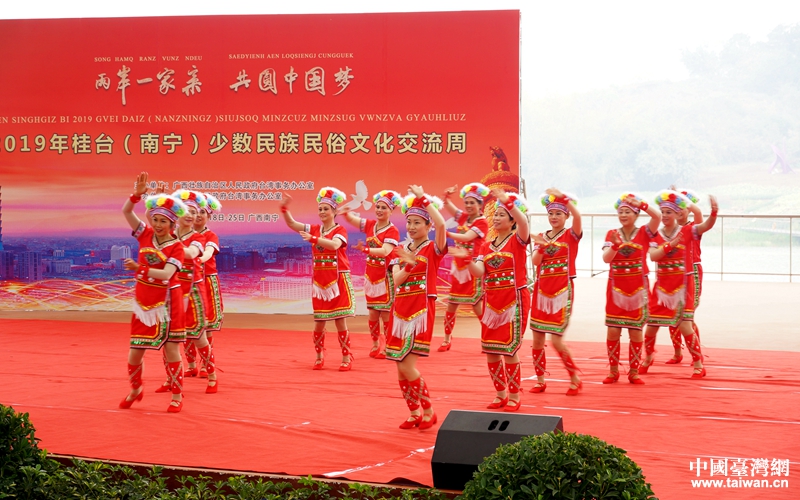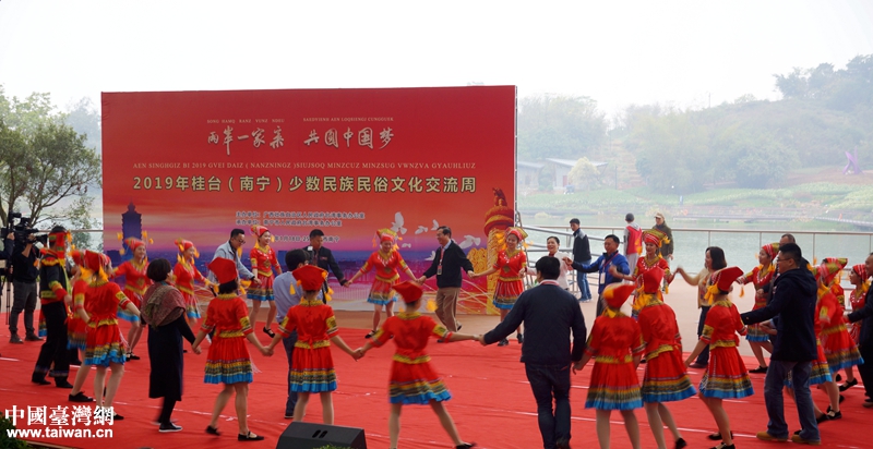 兩岸同胞代表在《我們都是一家人》歌曲中同跳侗族多耶歌圍圈舞。(圖片來源:廣西南寧市臺辦)