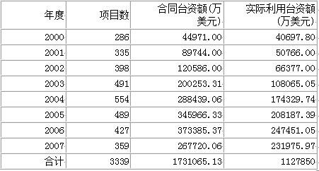 表2:2000年—2007年山東利用臺資情況
