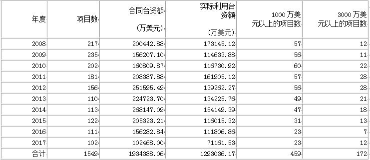 經(jīng)過山東省方方面面的共同努力,山東對臺經(jīng)貿(mào)交流合作邁入融合推進(jìn)的新階段,魯臺經(jīng)貿(mào)合作不斷深化,規(guī)模持續(xù)擴(kuò)大、領(lǐng)域不斷拓展、質(zhì)量穩(wěn)步提升,2008年-2017年山東省批準(zhǔn)臺資項(xiàng)目1549個(gè),合同臺資193.4億美元,實(shí)際利用臺資129.3億美元,臺資項(xiàng)目質(zhì)量明顯提高,大項(xiàng)目增多,截至2017年底,山東省總投資1000萬美元以上的臺資項(xiàng)目共1057個(gè),其中總投資額在3000萬美元以上項(xiàng)目210個(gè)。