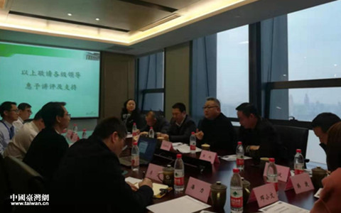 武漢市臺辦主任劉紅鳴(右4)、武昌區委常委陳鵬(右3)一行聽取企業負責人介紹企業情況。(武漢市臺辦 潘力 攝)