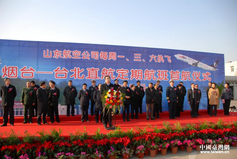 2011年2月,煙臺—臺北直航定期航班首航儀式在煙臺萊山國際機場隆重舉行。(圖片來源:煙臺市臺港澳辦)