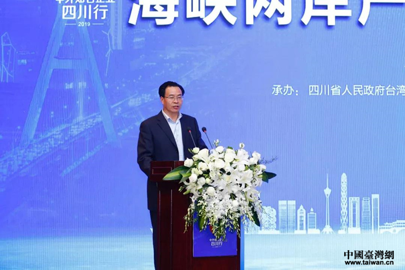 全國(guó)工商聯(lián)副主席、四川省政協(xié)副主席陳放出席推介會(huì)并致辭。(圖片來源:四川臺(tái)辦)
