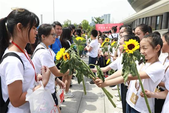 當天上午,作為小小“東道主”,江蘇大劇院童聲合唱團的團員們,為遠道而來的朋友們舉行了歡迎儀式,向他們贈送了代表陽光與熱情的向日葵,并合影留念。