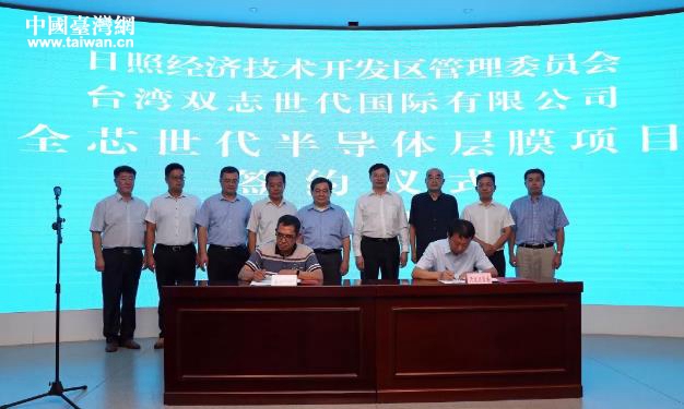 中國臺灣網8月6日訊 近日,山東日照經濟技術開發區與臺灣雙志世代國際有限公司簽訂合作協議,全芯世代半導體層膜項目落戶開發區。區工委書記杜江濤,臺灣雙志世代國際有限公司董事長戴榮志出席活動。區工委委員、管委副主任邱兵與項目負責人簽約。