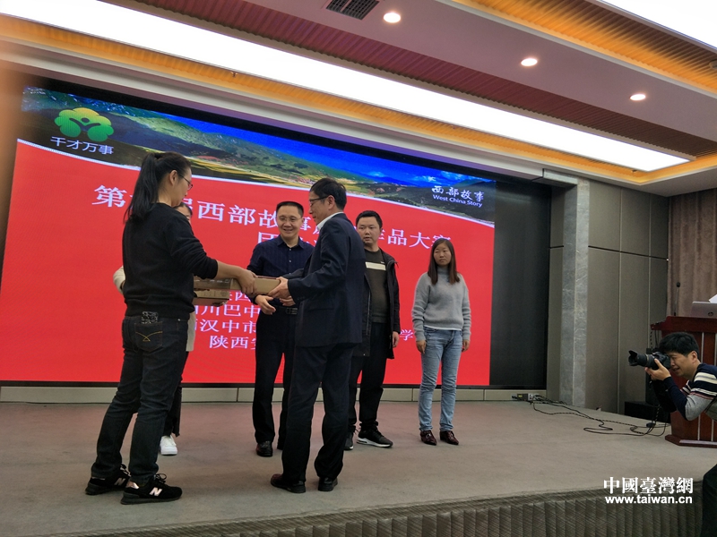 會上為獲得“西部故事”原創(chuàng)作品大賽代表頒發(fā)獎品。(圖片來源:甘肅省臺辦)