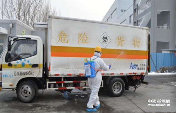 北京潤泰環(huán)保公司作為北京市指定的唯一一家處理新冠肺炎醫(yī)療廢棄物的企業(yè)。圖為醫(yī)廢運輸車稱重、離廠消毒。(中國臺灣網(wǎng)發(fā))