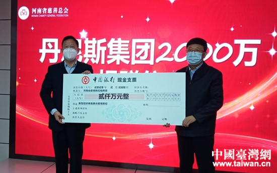 中國臺灣網2月28日訊 27日上午,在鄭臺企丹尼斯集團向河南省慈善總會捐贈2000萬元,支持河南省新冠肺炎疫情防控工作。這是新冠肺炎疫情發生以來,河南省慈善總會接收的最大一筆捐贈資金。