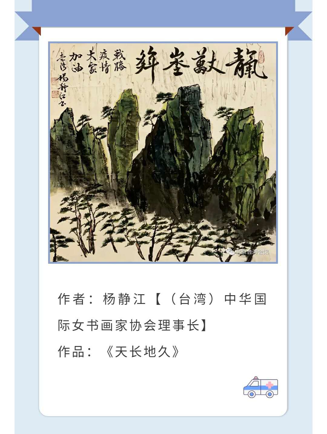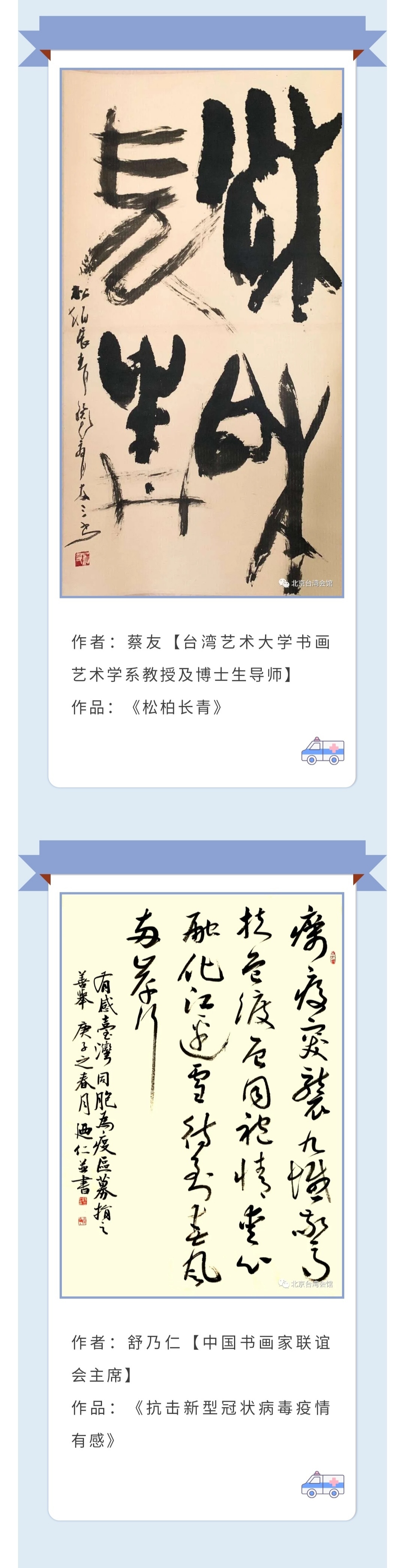 這些作品中,有以《同氣連枝 共盼春來(lái)》《青山一道同云雨 明月何曾是兩鄉(xiāng)》等為主題的飽含同胞之情、體現(xiàn)血脈相連的書(shū)法作品,也有向戰(zhàn)斗在一線醫(yī)務(wù)工作者致敬、為偉大中華祈福的書(shū)畫(huà)作品;作品將分為兩期,在北京臺(tái)灣同胞聯(lián)誼會(huì)網(wǎng)站和公眾號(hào),北京臺(tái)灣會(huì)館公眾號(hào)及中國(guó)書(shū)畫(huà)家聯(lián)誼會(huì)微信公眾號(hào)、官方微博、網(wǎng)站共同展出。(中國(guó)臺(tái)灣網(wǎng)、北京市臺(tái)聯(lián) 聯(lián)合報(bào)道)