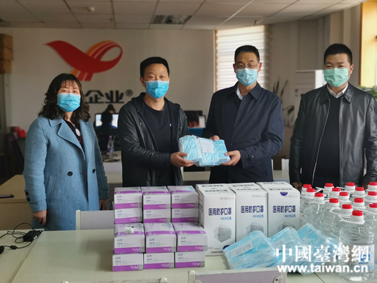 崔鵬沖代表省臺辦向蘭州統一食品有限公司贈送防疫物資。 (中國臺灣網 發)