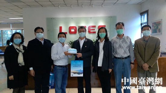 調研組向企業和商戶贈送口罩等防疫用品。 (中國臺灣網 發)