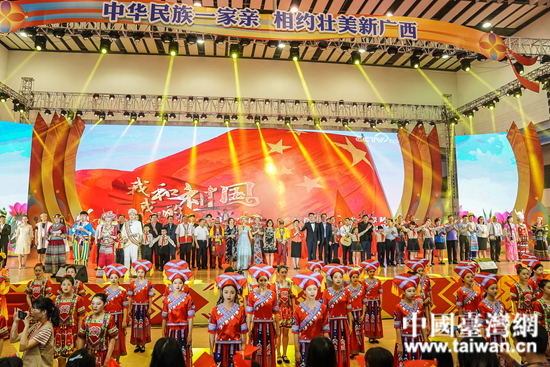 桂臺(tái)各民族歡度“壯族三月三”大聯(lián)歡,合唱《我和我的祖國(guó)》。 (中國(guó)臺(tái)灣網(wǎng) 發(fā))
