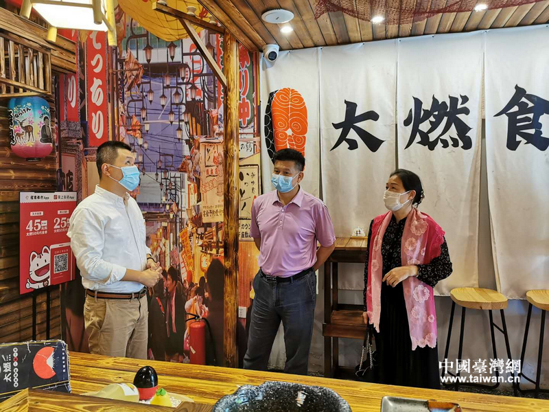 丘德彬(中)與太燃臺式日料店負責人陳立軒(左)交流(圖片來源:廣西南寧市臺辦)