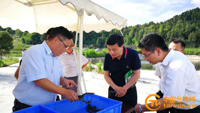 袁明副主任詳細(xì)了解川臺(tái)緣公司澳洲小龍蝦養(yǎng)殖情況(圖片來(lái)源:四川省臺(tái)辦)