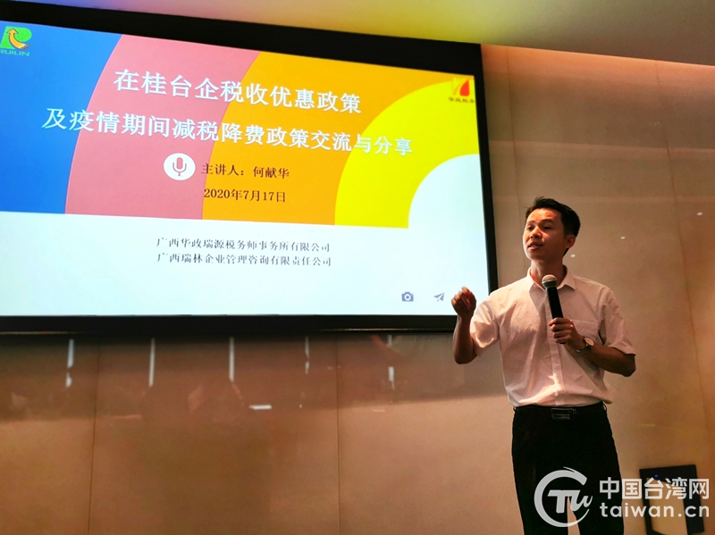 特聘講師何獻(xiàn)華做在桂臺企稅收優(yōu)惠政策講座輔導(dǎo)。(圖片來源:廣西南寧市臺辦)