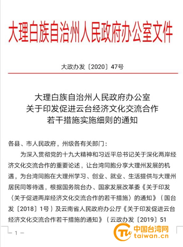 中國臺灣網1月22日訊 為深入貫徹黨的十九大精神和習近平總書記關于深化兩岸經濟文化交流合作的重要思想,積極踐行“兩岸一家親”理念,讓臺灣同胞分享云南省大理州發展機遇,為臺灣同胞在大理州學習、創業、就業、生活提供與大理州居民同等待遇,大理州結合實際,制定出臺了《大理白族自治州人民政府辦公室關于印發促進云臺經濟文化交流合作若干措施實施細則的通知》(以下簡稱大理州惠臺“50條措施”)。