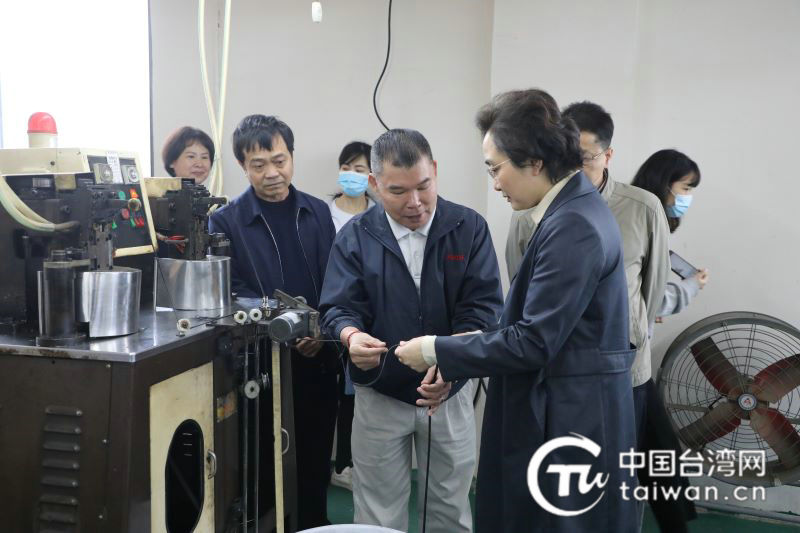 李莉(前一)深入生產車間考察臺企廣西精記拉鏈有限公司產品(圖片來源:廣西臺辦提供)