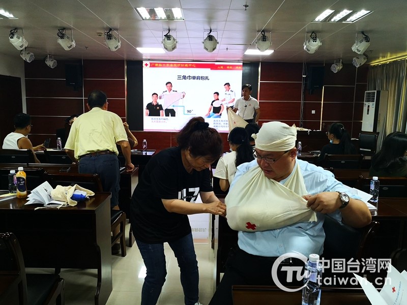 中國臺灣網9月1日訊 這邊在做心肺復蘇,那邊在進行止血、包扎、固定、搬運……日前,由廣西南寧市臺辦主辦,南寧市紅十字會、南寧市臺協協辦的南寧市關愛臺商臺胞系列活動之急救醫療培訓在南寧市紅十字會備災救災服務中心會議室舉辦,在邕臺胞臺商代表30人參加。