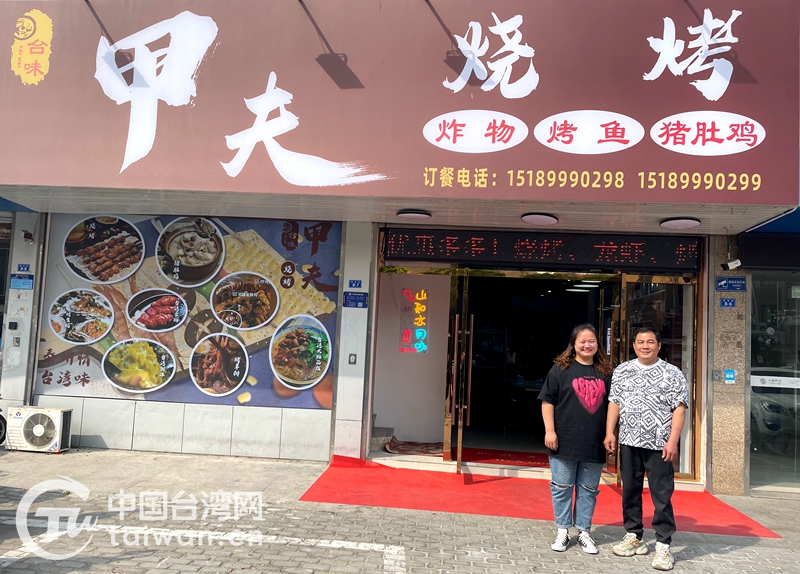夫妻倆與小吃店合影(圖片來(lái)源:泰州市海陵區(qū)臺(tái)辦)