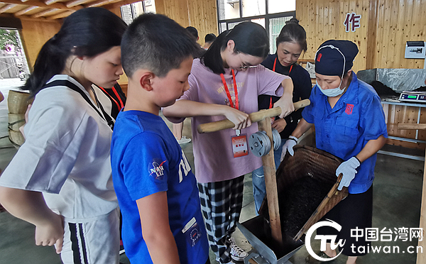 兩岸青少年體驗制作手筑伏磚茶過程。(中國臺灣網發)