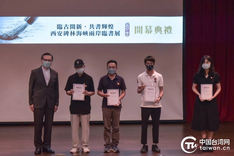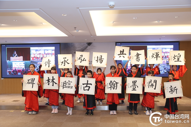 開(kāi)幕式上,主辦方為獲得書(shū)法作品一、二、三等獎(jiǎng)的臺(tái)灣獲獎(jiǎng)代表頒發(fā)了獲獎(jiǎng)證書(shū)。來(lái)自中國(guó)宋慶齡青少年科技文化交流中心書(shū)法班的小朋友還在北京會(huì)場(chǎng)向兩岸嘉賓展示他們書(shū)寫(xiě)的16字書(shū)法作品——“碑林臨古,翰墨開(kāi)新,傳承弘揚(yáng),共書(shū)輝煌”,贏得兩岸嘉賓的熱烈掌聲和一致贊嘆。