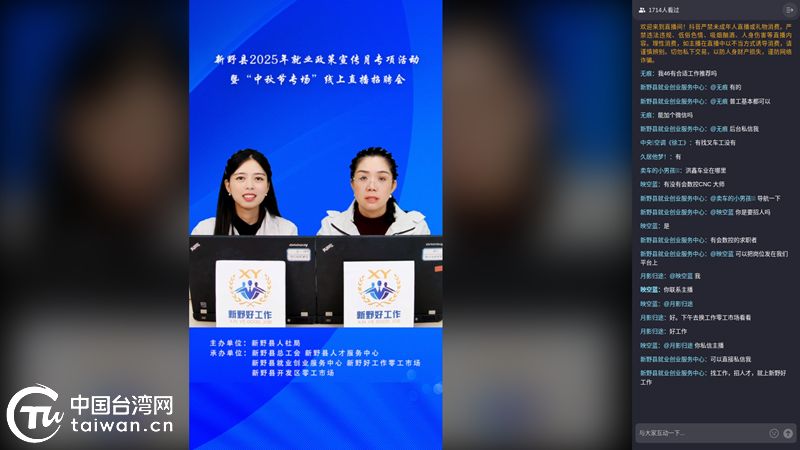 中國臺(tái)灣網(wǎng)10月10日訊 月圓人團(tuán)圓,職等你來圓。為助力企業(yè)解決用工難題,搭建高效就業(yè)供需對(duì)接平臺(tái),10月5日,南陽市新野縣舉行“2025年就業(yè)政策宣傳月專項(xiàng)活動(dòng)暨中秋節(jié)專場(chǎng)招聘會(huì)”臺(tái)資企業(yè)直播招聘會(huì),以“直播帶崗”形式,為企業(yè)與求職者牽線搭橋。