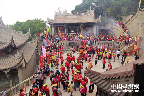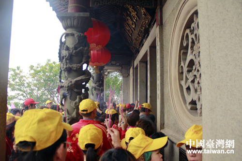 媽祖誕辰愈近,來湄洲媽祖祖廟謁祖的普通進香團、大型進香團劇增,圖為4月20日早上媽祖廟進香人潮。(中國臺灣網 楊麗 攝)