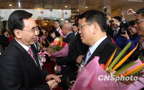 “二00九年廣州市授予榮譽(yù)市民大會(huì)”十一月二十六日在廣州舉行,大會(huì)向二十六位海外僑胞、港澳臺(tái)同胞和國際友人授予廣州市榮譽(yù)市民稱號(hào),以表彰他們多年來對廣州市經(jīng)濟(jì)建設(shè)和社會(huì)公益事業(yè)等方面做出的貢獻(xiàn)。這次被授予稱號(hào)的二十六位榮譽(yù)市民中,香港同胞十人,澳門同胞兩人,臺(tái)灣同胞六人,外籍華人兩人,外國友人六人。據(jù)不完全統(tǒng)計(jì),這二十六位榮譽(yù)市民多年來在廣州市共投資和引資一百二十九億元人民幣,捐贈(zèng)和引薦捐資二點(diǎn)五二億人民幣。圖為廣州市委書記朱小丹在東方賓館迎接榮譽(yù)市民。中新社發(fā) 羅仰明 攝