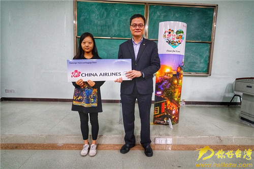 華航廣州辦事處總經理毛禮忠則為同學們分享了他的旅游心得、并為獲得廣州往返臺北免費機票的幸運同學頒了獎,他鼓勵同學們多在旅行中增廣見聞。
