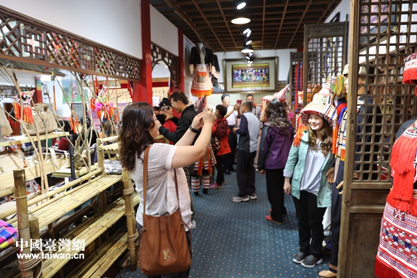 臺灣花蓮縣民族文化參訪團在賀州市瑤族文化體驗館了解瑤族服飾特色。(圖片來源:賀州市臺辦)