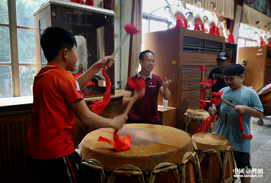 中國臺灣網8月5日訊 日前,廣西南寧市馬山縣山城壯族會鼓協會的5名技師到臺灣花蓮縣新城鄉,向當地14名花蓮同胞傳授馬山壯族會鼓擊打技藝。