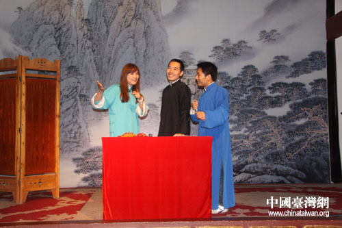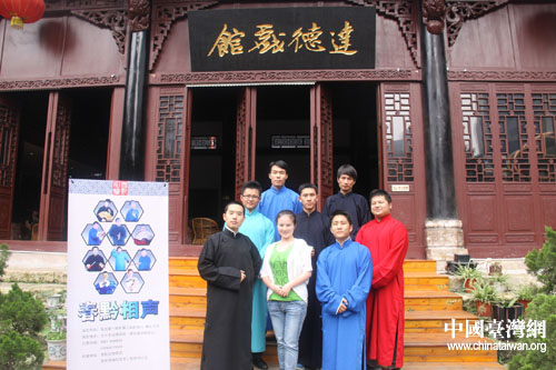 中國臺(tái)灣網(wǎng)7月13日貴陽消息 長衫、布鞋、折扇、醒木、手絹、快板,這幾個(gè)關(guān)鍵詞勾勒的,可不是一板一眼站在臺(tái)前說相聲的老夫子,而是幾個(gè)“80后”的年輕人——穆伍、洪方舟、陳丹等。每月第一、三周六晚上的8點(diǎn),在貴陽市達(dá)德書院,“春黔相聲工作室”的幾個(gè)80后年輕人會(huì)身穿長衫,手拿快板,用夾雜著現(xiàn)代詞匯的“傳統(tǒng)相聲”來博得滿場(chǎng)的喝彩。通過網(wǎng)絡(luò)了解到貴陽有這樣一群熱愛、傳承中華傳統(tǒng)藝術(shù)的年輕人,臺(tái)灣東森電視臺(tái)《生活接力棒》欄目組便來到這里對(duì)他們進(jìn)行采訪,希望向廣大觀眾傳遞一種精神——夢(mèng)想與堅(jiān)持。