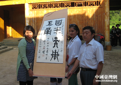 中國(guó)臺(tái)灣網(wǎng)7月19日黔南消息 日前,2012年臺(tái)胞青年夏令營(yíng)貴州分營(yíng)在黔南三都水族自治縣觀光考察結(jié)束,縣委統(tǒng)戰(zhàn)部受縣人民政府的委托、代表全縣30多萬(wàn)水族人民,給全體營(yíng)員贈(zèng)送了“中華兒孫萬(wàn)年興”、“國(guó)興人壽年春”兩幅水書(shū)作品。臺(tái)胞帶隊(duì)老師呂素貞接到條幅表示,一定要珍惜,攜手并進(jìn),造福于子孫后代。(中國(guó)臺(tái)灣網(wǎng)黔南州臺(tái)辦通訊員 羅世云)
