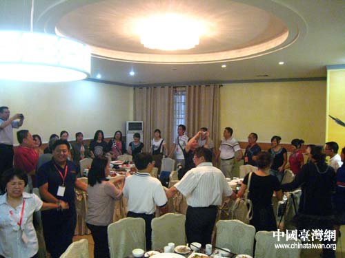 在歡迎晚宴上,大家手牽著手,唱起了“我們都是一家人”。(圖片來(lái)源:黔南州臺(tái)辦)